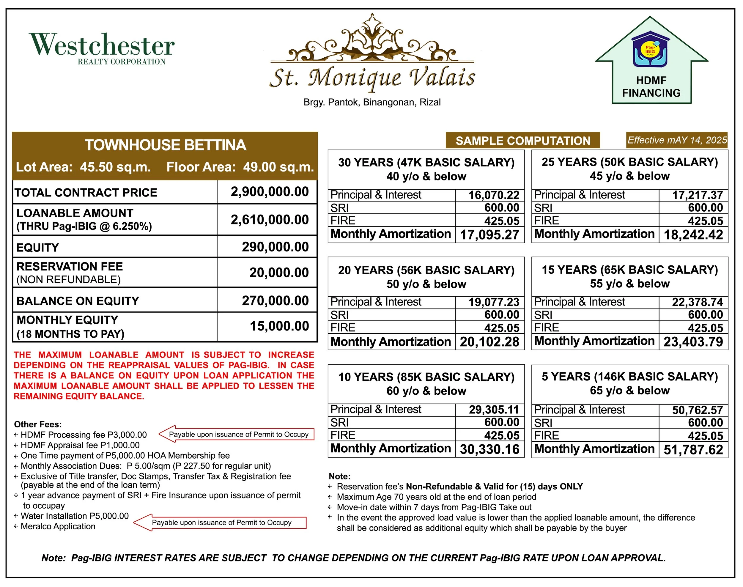 St. Monique Valais is a 100-hectare more or less subdivision in Barangay Darangan and Pantok, Binangonan, Rizal. It offers four types of townhouses namely: Bella, Bianca, Betinna and Briena. The main entrance gate is along Quarry Road, about 3.30 kilometers from Manila East Road and approximately 5.0 kilometers from the Municipal Hall of Binangonan.